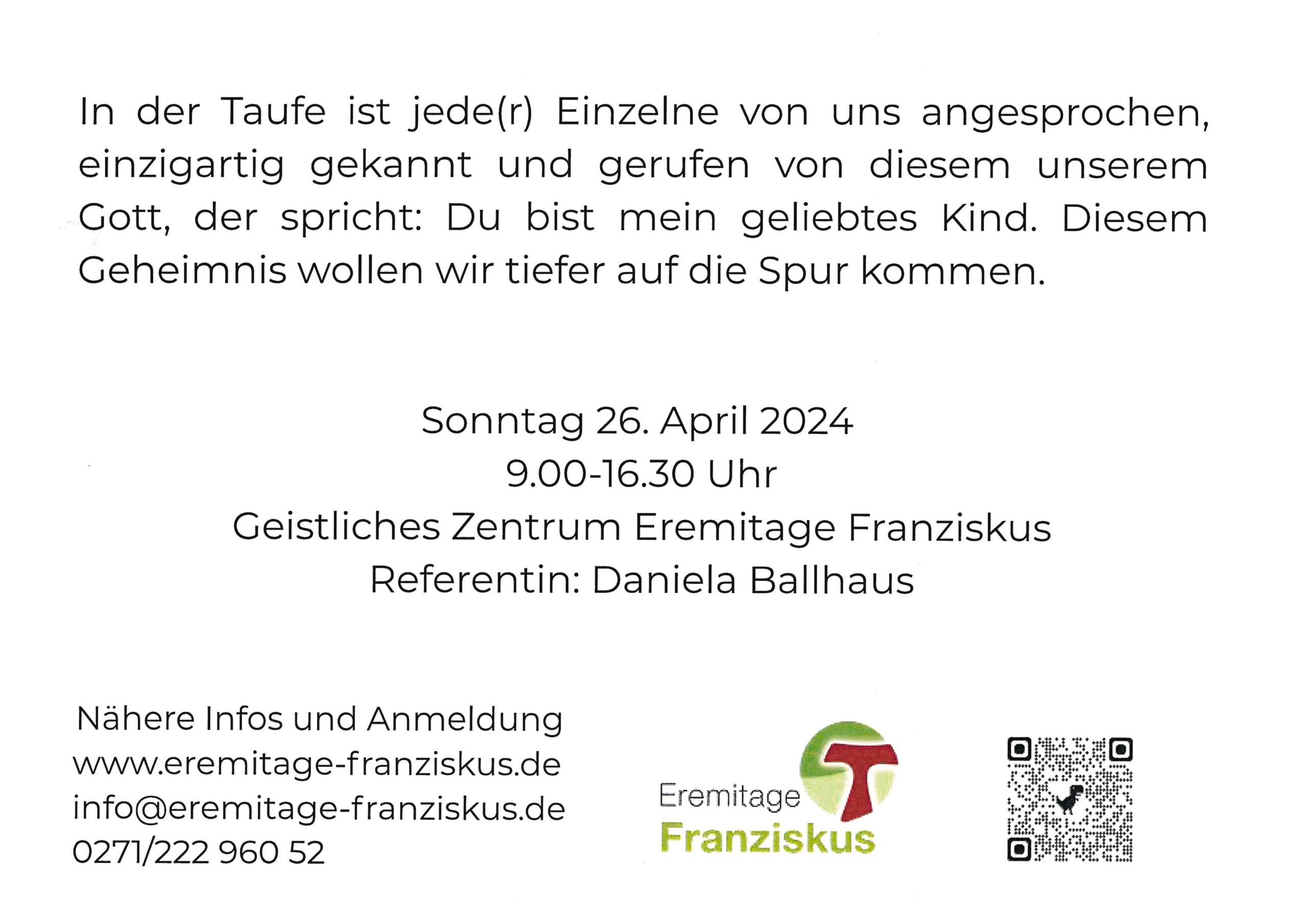 Sonntag 26. April von 9 – 16.30 Uhr im Geistlichen Zentrum Eremitage Franziskus