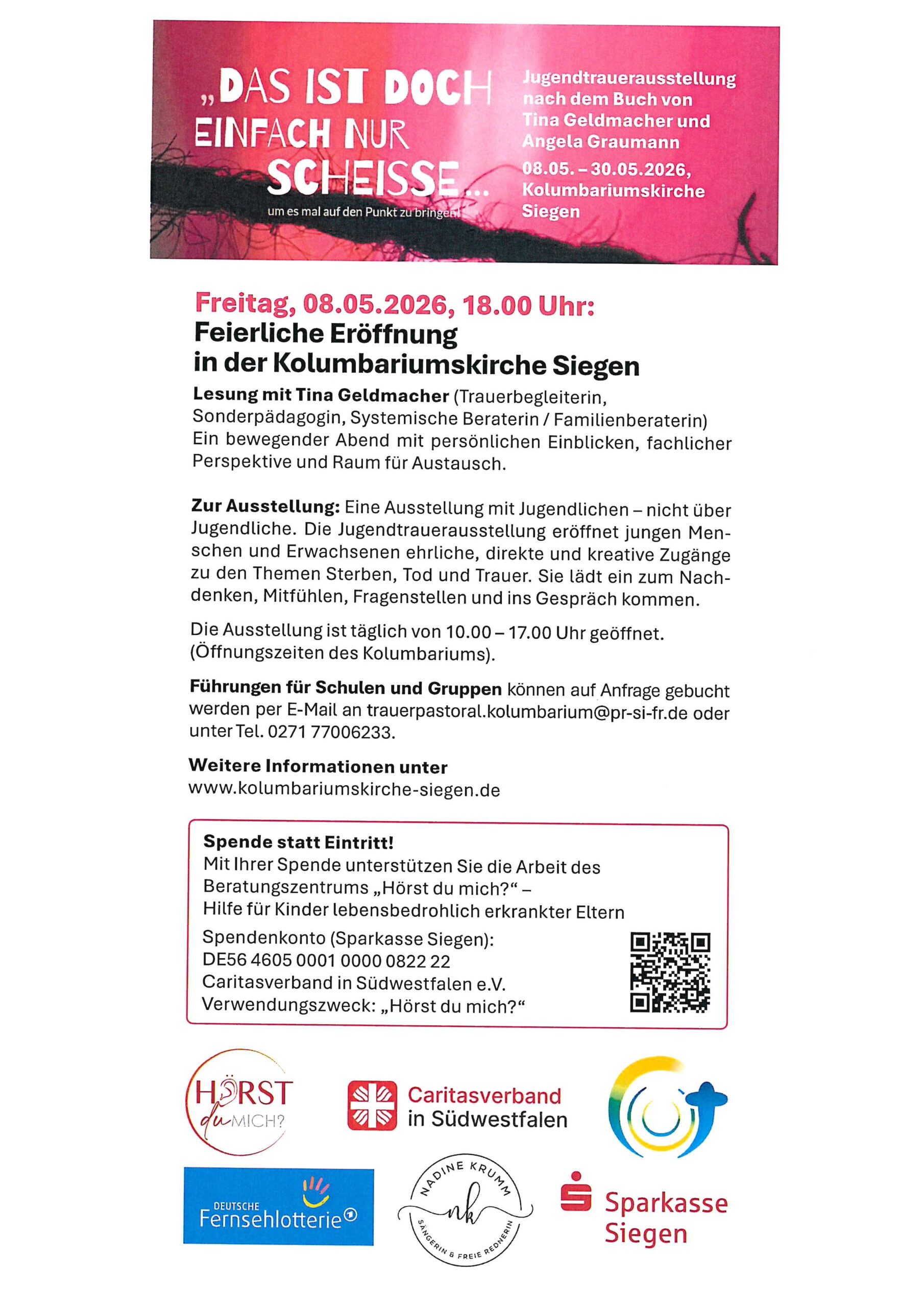„Das ist doch einfach nur Scheiße … um es mal auf den Punkt zu bringen“ ist eine Ausstellung für Jugendliche, keine Ausstellung ÜBER Jugendliche. Sie zeigt in unkommentierten Interviews, Bildern wie unterschiedlich Jugendliche und junge Erwachsene mit ihrer Trauer umgehen. Tina Geldmacher und Angela Graupmann, beide Trauerbegleiterinnen aus Köln haben sie mit ehrlichen und unkommentierten Zugängen zusammengestellt.