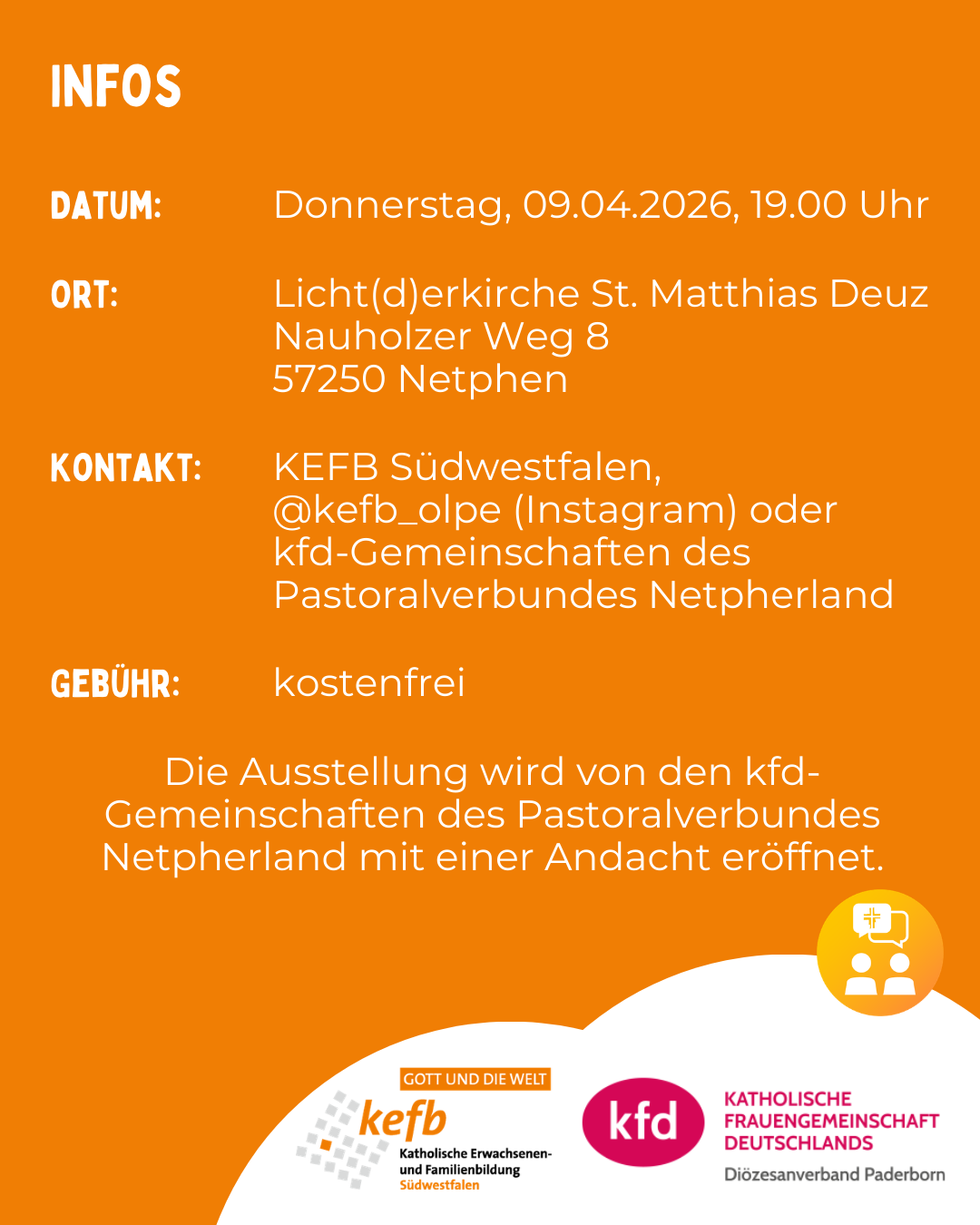 Donnerstag, 09.04.2026, 19.00 Uhr, Eröffnung der Ausstellung mit einer Andacht, gest. von den kfd-Gemeinschaften. Montag, 13.04.2026, 19.00 Uhr, Lesung zum Thema „Schwestern im Licht – Tradwife (traditionelle Ehefrau) oder Widerstand“, anschl. Diskussion. Sonntag, 19.04.2026, 17.00 Uhr, Gottesdienst mit Diözesanpräses Roland Schmitz, mit dem Frauenchor Johannland.
